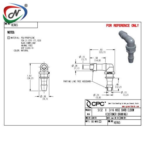 HER65 Elbow Reducer Fitting, 6/32 HB x 5/32 HB, Polypropylene