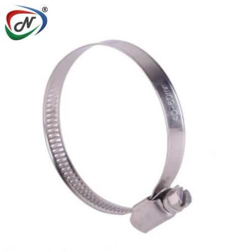 German Type Hose Clamp consist of a band, often galvanized or stainless steel, into which a screw thread pattern has been cut or pressed.One end of the band contains a captive screw. The clamp is put around the hose or tube to be connected, with the loose end being fed into a narrow space between the band and the captive screw. When the screw is turned, it acts as a worm drive pulling the threads of the band, causing the band to tighten around the hose (or when screwed the opposite direction, to loosen). Screw clamps are normally used for hoses 1/2 inch diameter and up, with other clamps used for smaller hoses.
